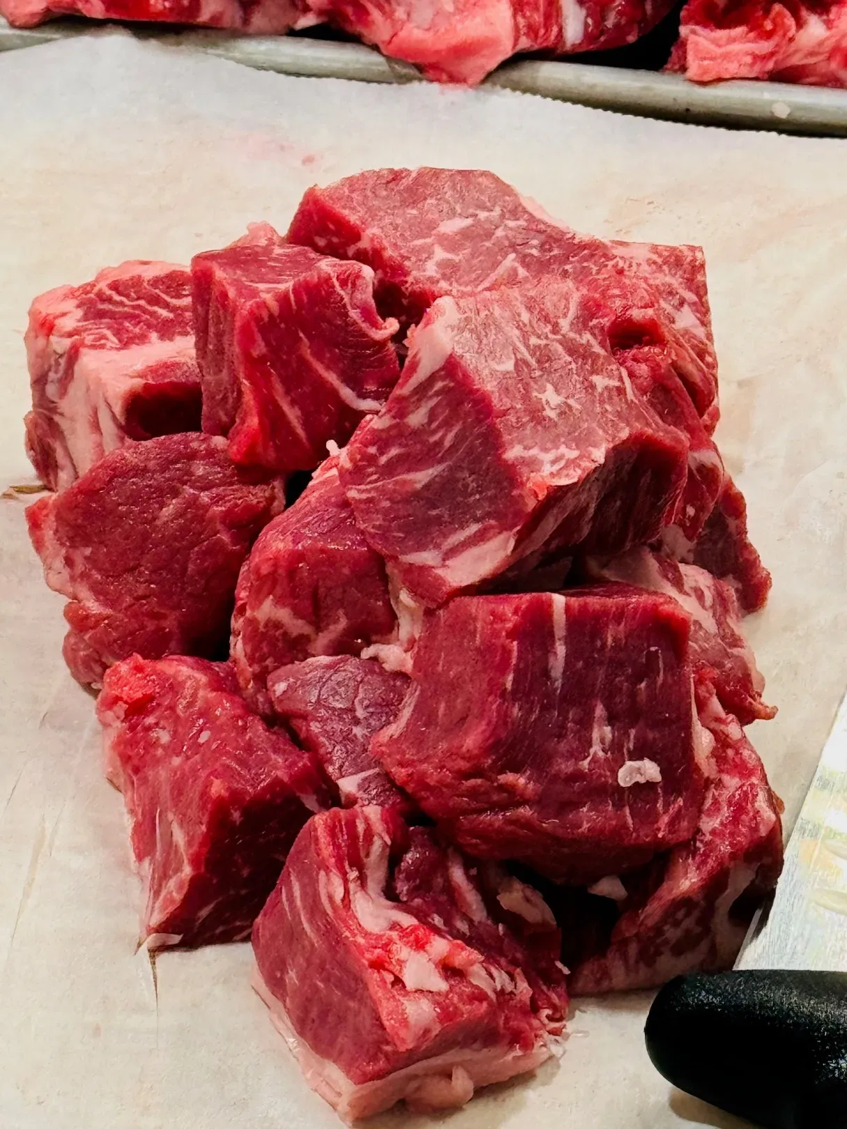 This group of photos shows how I break down the nerve end into diced Kabob meat suitable for skewers or blackened steak bites. Notice the un-trimmed nerve end with the tendon going right through the middle of eye of the loin. If left in on steaks cut this part they would be unpleasant to eat since the tendon is tough and not chewable. Chefs in high end restaurants do not use this part for steaks however most grocery stores will cut this into steaks and sell this to unsuspecting consumers. Buyer Beware! In the top right image I show how to “C” cut out the tendon and cut the clean muscle into 1 1/4″ cubes.