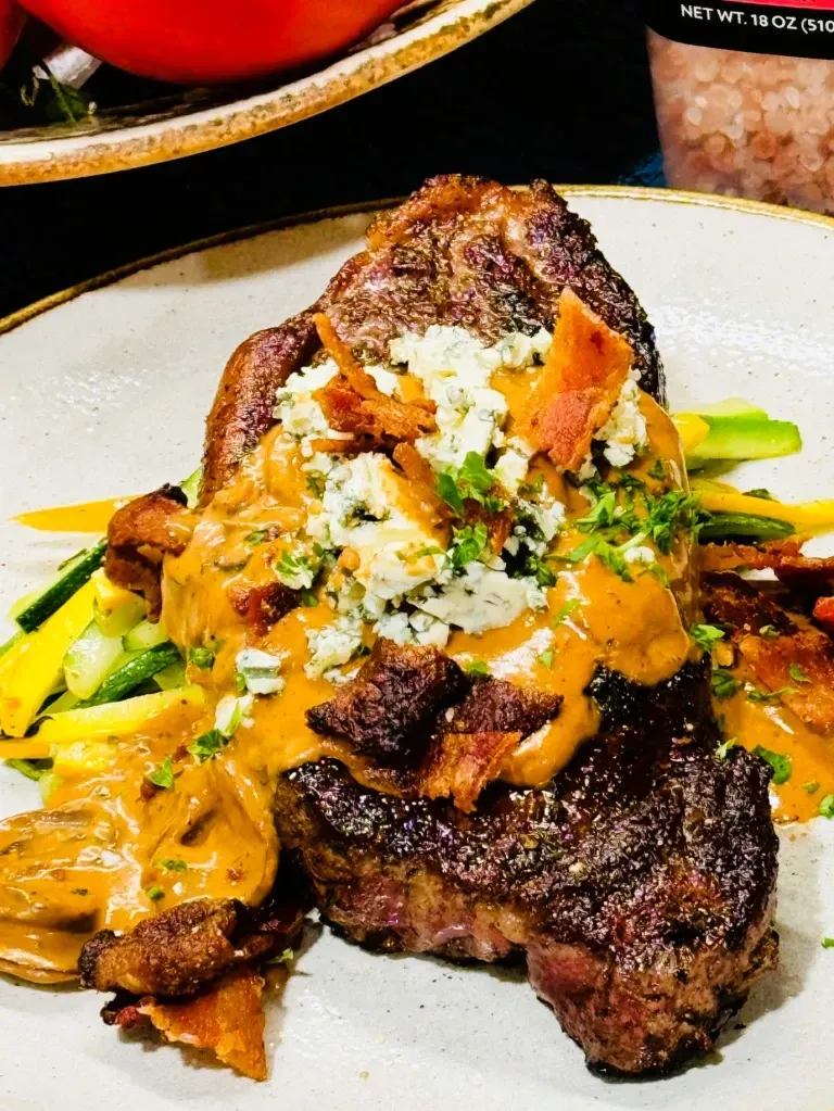 Here is another image of a sliced strip steak served on fingerling potatoes, and wild mushrooms with cippolini onions and bacon lardons. I use a Worcestershire compound butter and a rich port wine veal jus to finish the dish.
