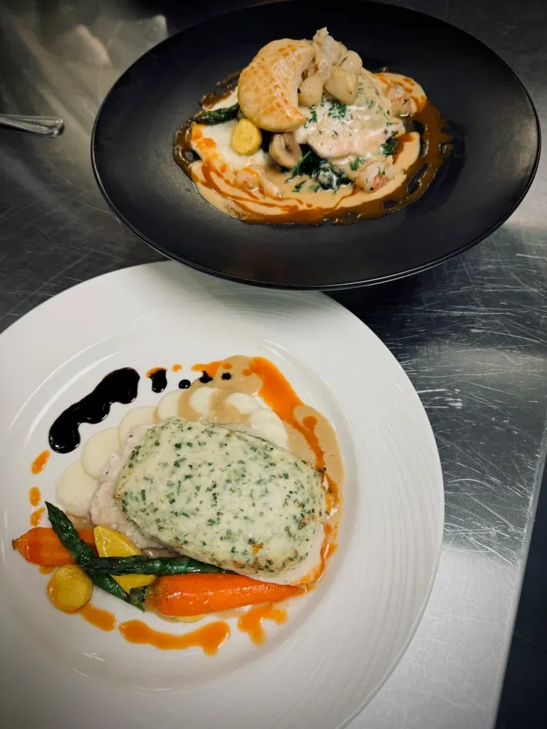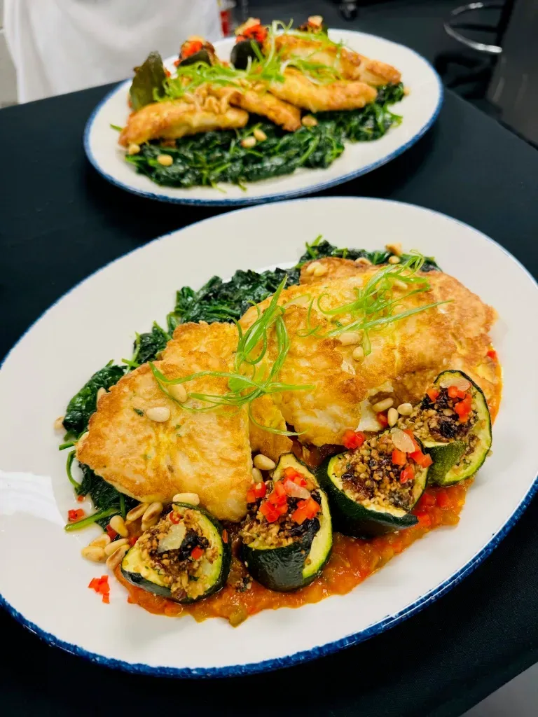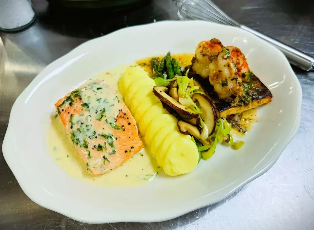 The second is from Culinary 101 class and is a oven poached salmon, crispy skin trout and garlic shrimp. Oven poaching is a simple yet delicious way to cook thin fillets of fish. After cooking, strain out the cooking liquid and prepare a sauce to go over the fish. Beurre Blanc or Vin Blanc are the two best sauces to make. Use herbs like Tarragon, Dill, Chives, Basil and Parsley for the best results.
