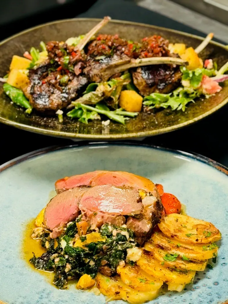 These top three dishes are stuffed leg of lamb with spinach, dried apricots and feta cheese. Grilled lamb chops with a olive, tomato and caper relish in the first image. This image was from my Fabrication class (butchering). Learning how to break down, portion and marinate large roasts and fish can help you to save time and money. By using a home vacuum sealer you can store the food for longer times in the freezer. Start with breaking down whole pork loins, chickens and sides of salmon and later move to more complicated procedures.