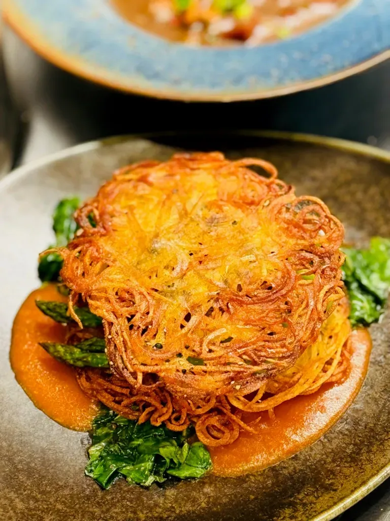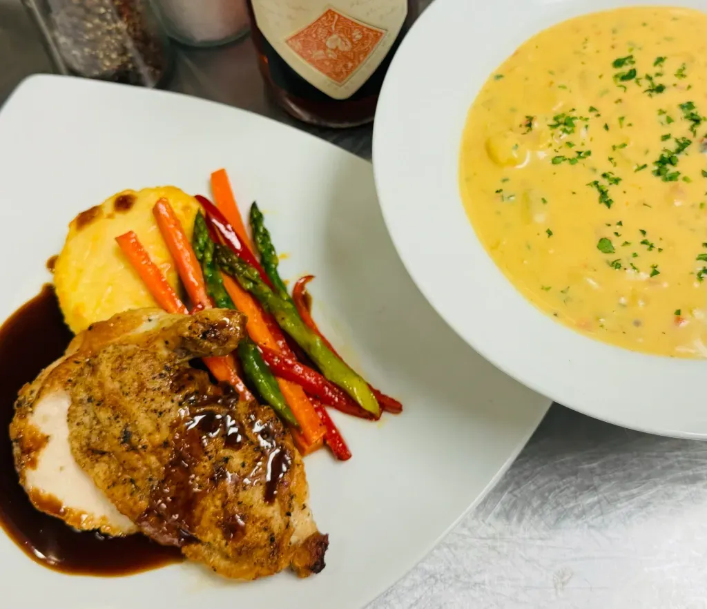 The last image is a vegetarian dish with crispy potato disks layered with mashed potatoes, grilled portabella mushrooms and asparagus on a bed of spinach with a light tomato sauce. This dish came from one of my Soup and Sauces class. The sauce is made from roasted tomatoes and vegetables that were cooked and pureed prior to straining. This can be done simply with a hand held immersion blender and then straining and thickening with a cornstarch slurry to attain the correct consistency.