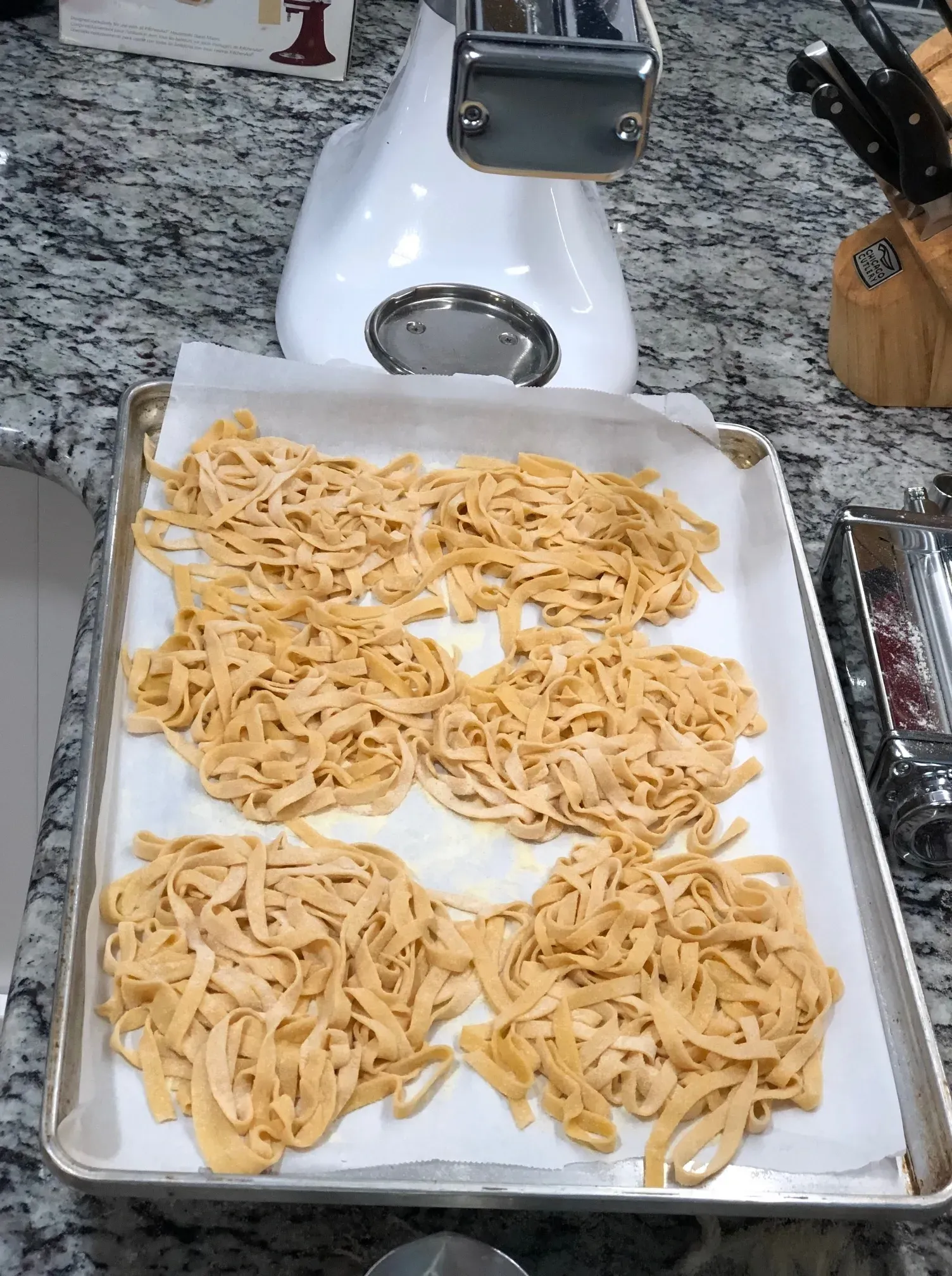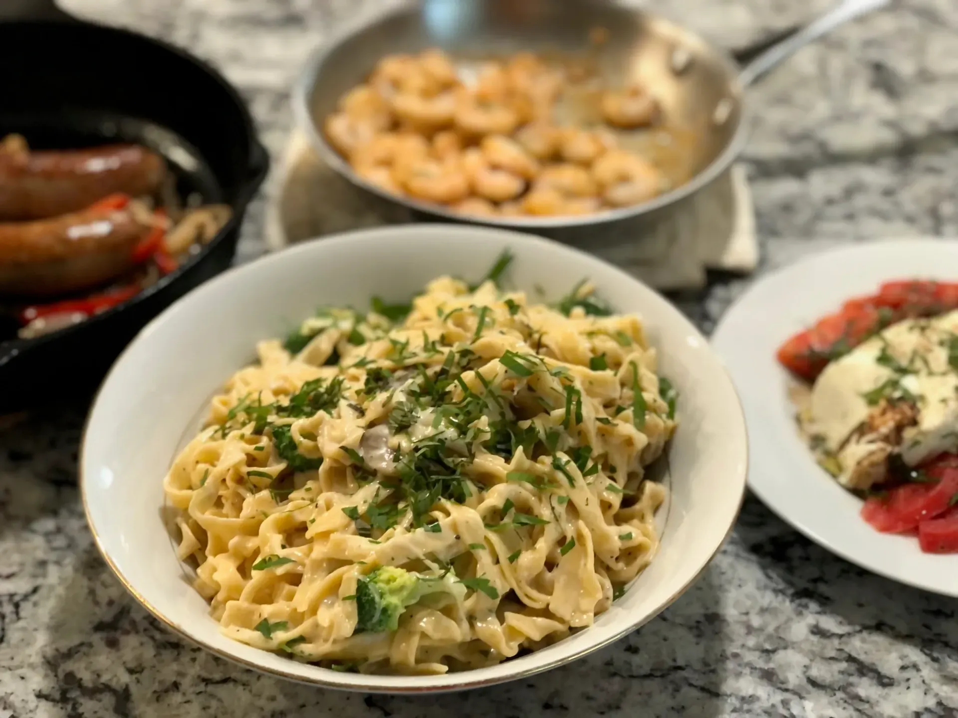 Made some fettucini with Alfredo sauce and basil served with Italian sausage, shrimp, and tomatoes Caprese style. Cooking in my new kitchen with vegetables from our home garden is a great joy for me and hope you too can find peace and happiness through cooking and enjoying your own food.