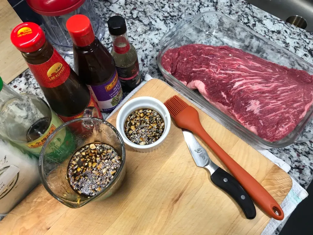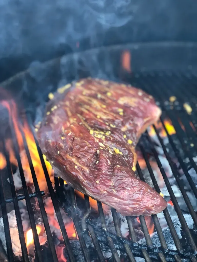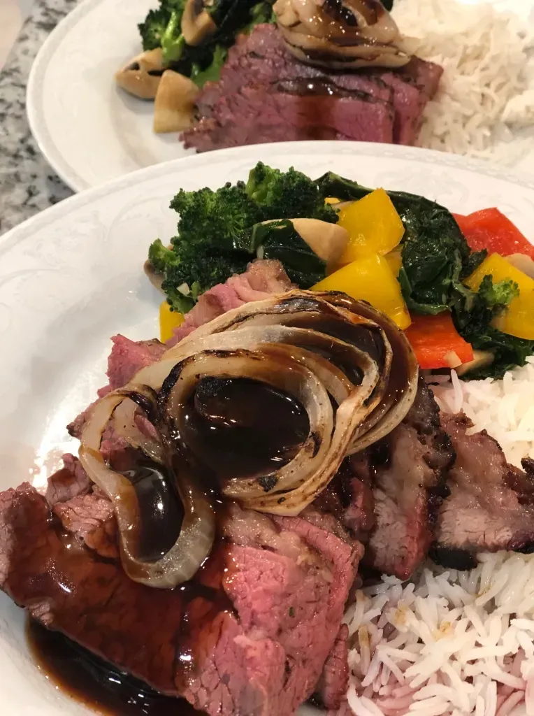 Grilled “Tri-Tip” of beef with Chinese ingredients in a Garlic Ginger marinade with rice and stir-fried vegetables. The vegetables include Kale from our winter garden.
