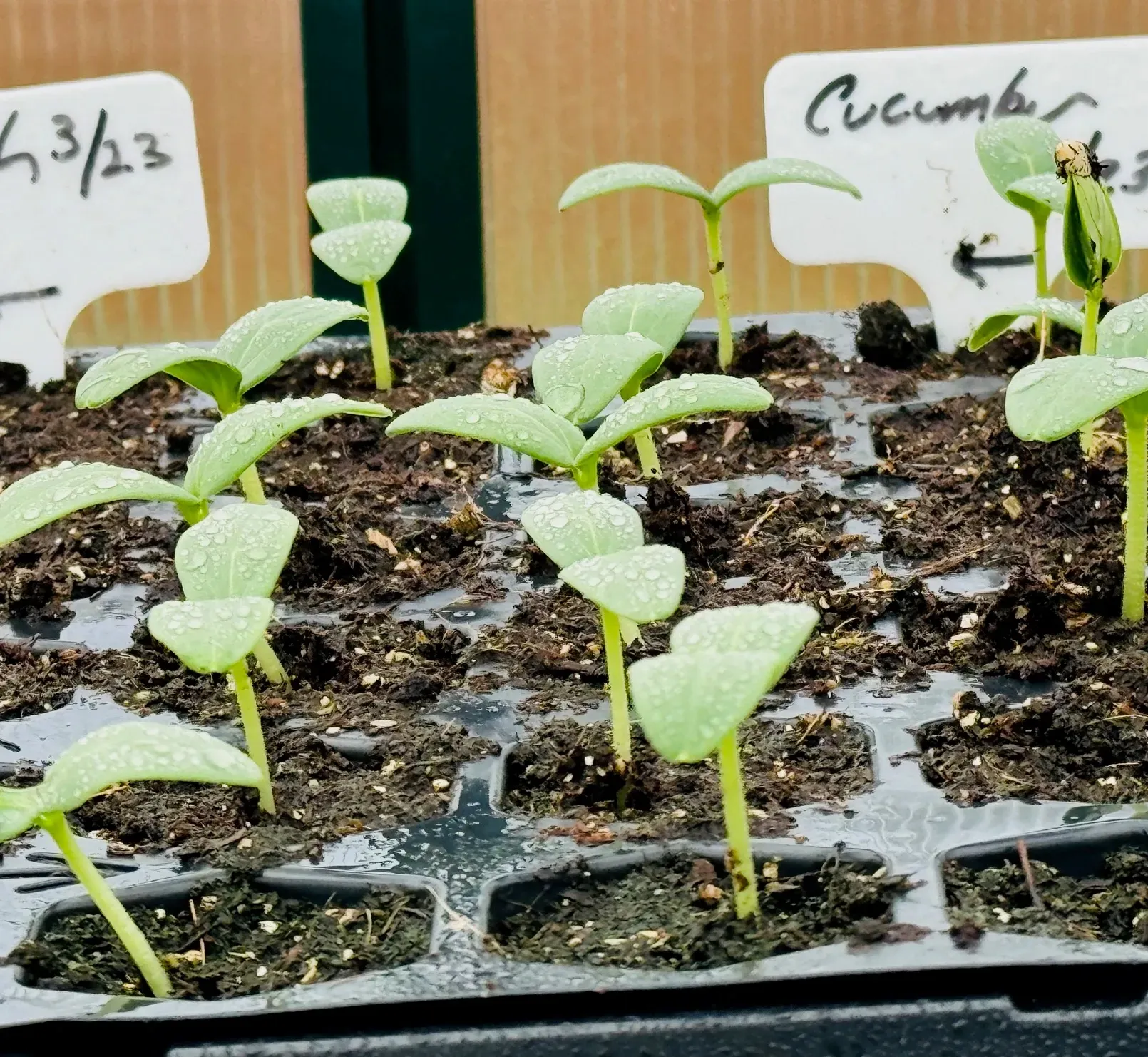 - Used the technique of up-watering by filling plastic trays with water and setting in the seedlings- don’t let the pots sit in the water longer than 4 to 6 hours. This helps prevent fog gnats from growing. However, we still got some.