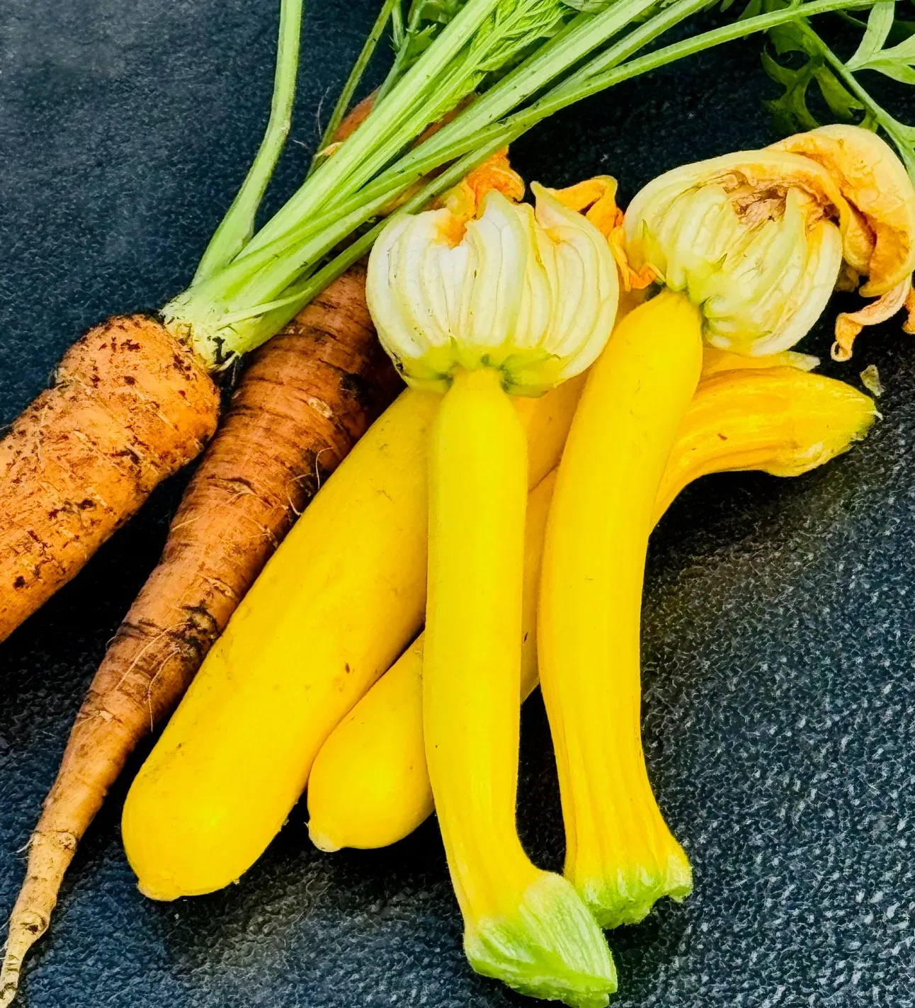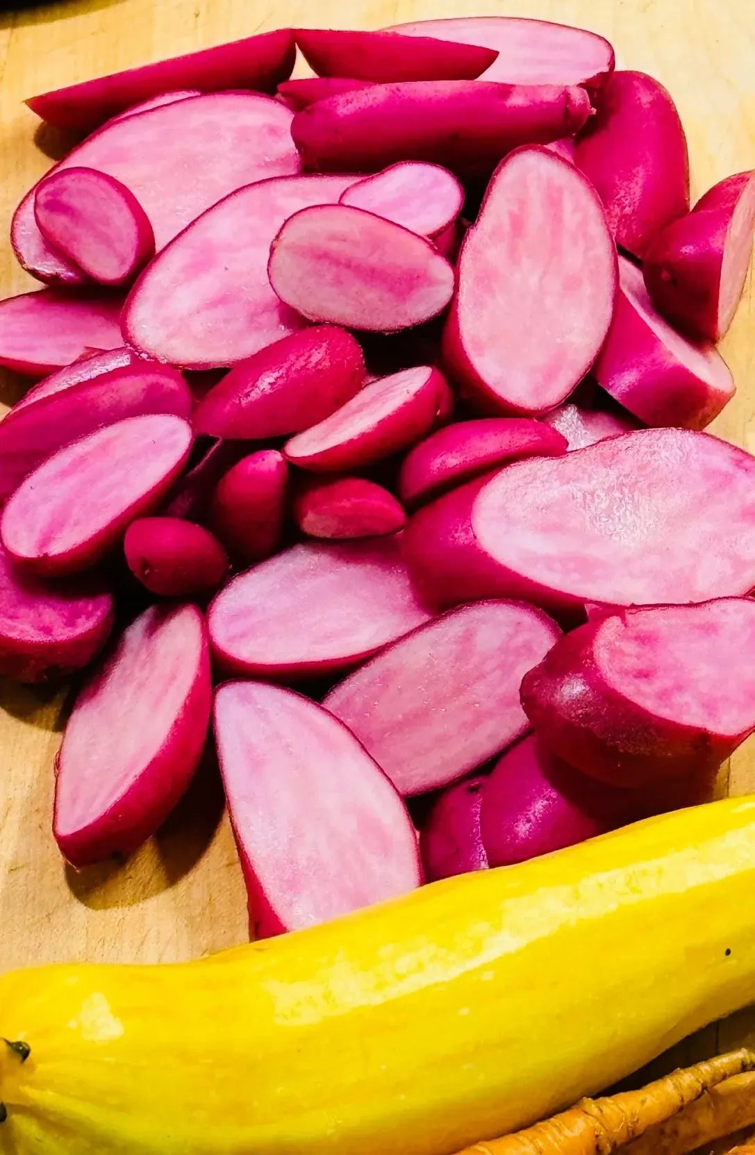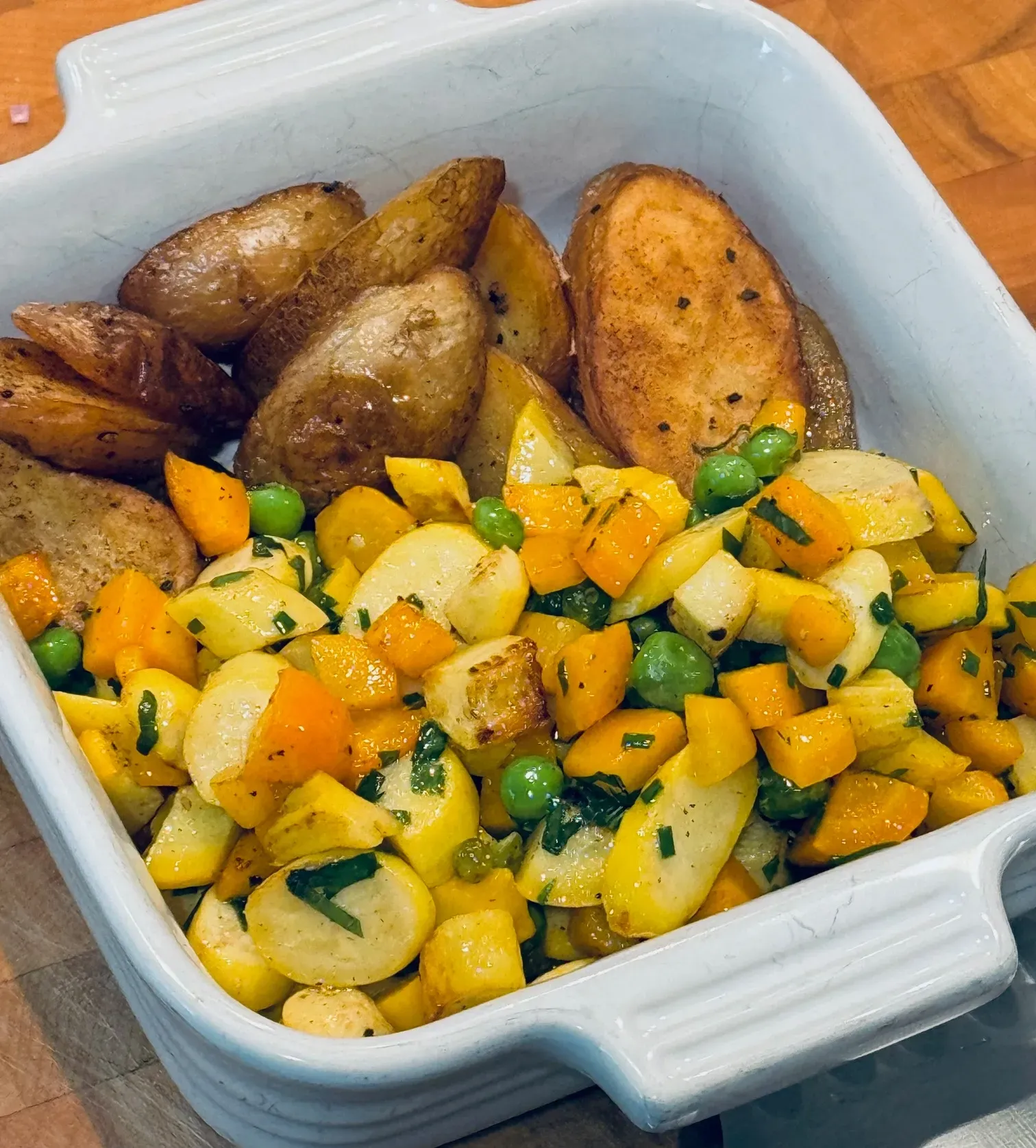 Sauteed fingerling potatoes in olive oil, bacon fat and fresh snipped rosemary with sea salt and cracked black pepper. These potatoes were grown from seed potatoes in grow bags which worked very well. If you have never had fingerlings, they are a waxy variety of which there are many variations. Simply delicious. Along with them I sauteed some young carrots, baby yellow squash with English peas and fresh basil chiffonade. Makes a great side for roasted chicken.