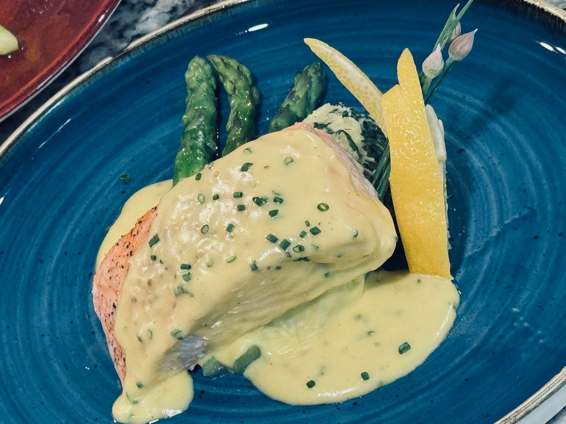 Asparagus and Salmon are a classic combination and both go well with a buttery lemon Hollandaise sauce. Mashed potatoes mixed with Kale is a variation of the Irish classic potato dish known as Colcannon potatoes and rounded out the plate. In this post I will describe how I cooked it with some tips on the process of growing Asparagus and how to cook the stems properly. When preparing this dish seek out the freshest salmon you can find. Here I used Farrow Island Norwegian salmon that I purchased from our best local fish monger at Seafood Express in Springfield - Express Foods | Fresh Seafood & Meat Market