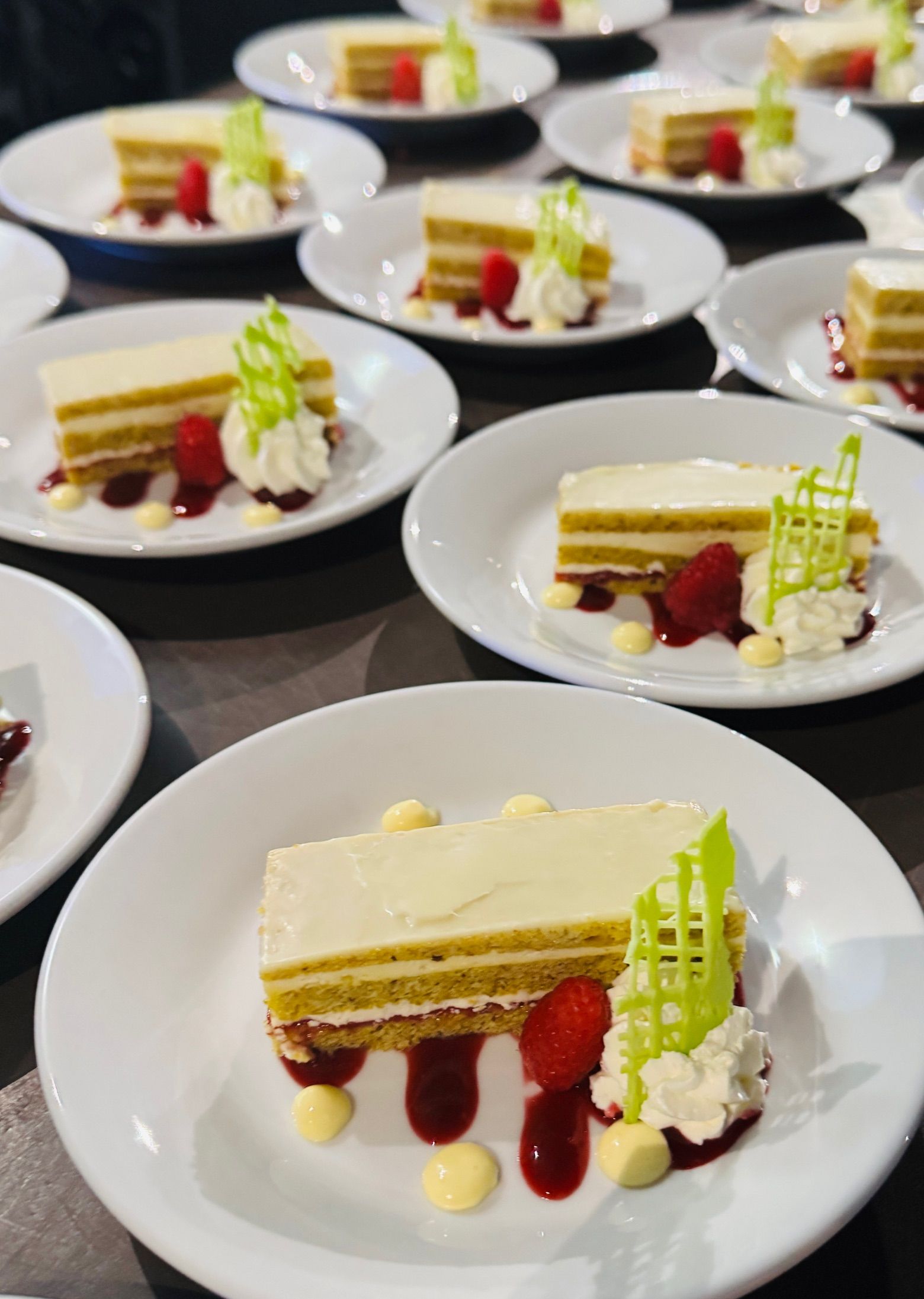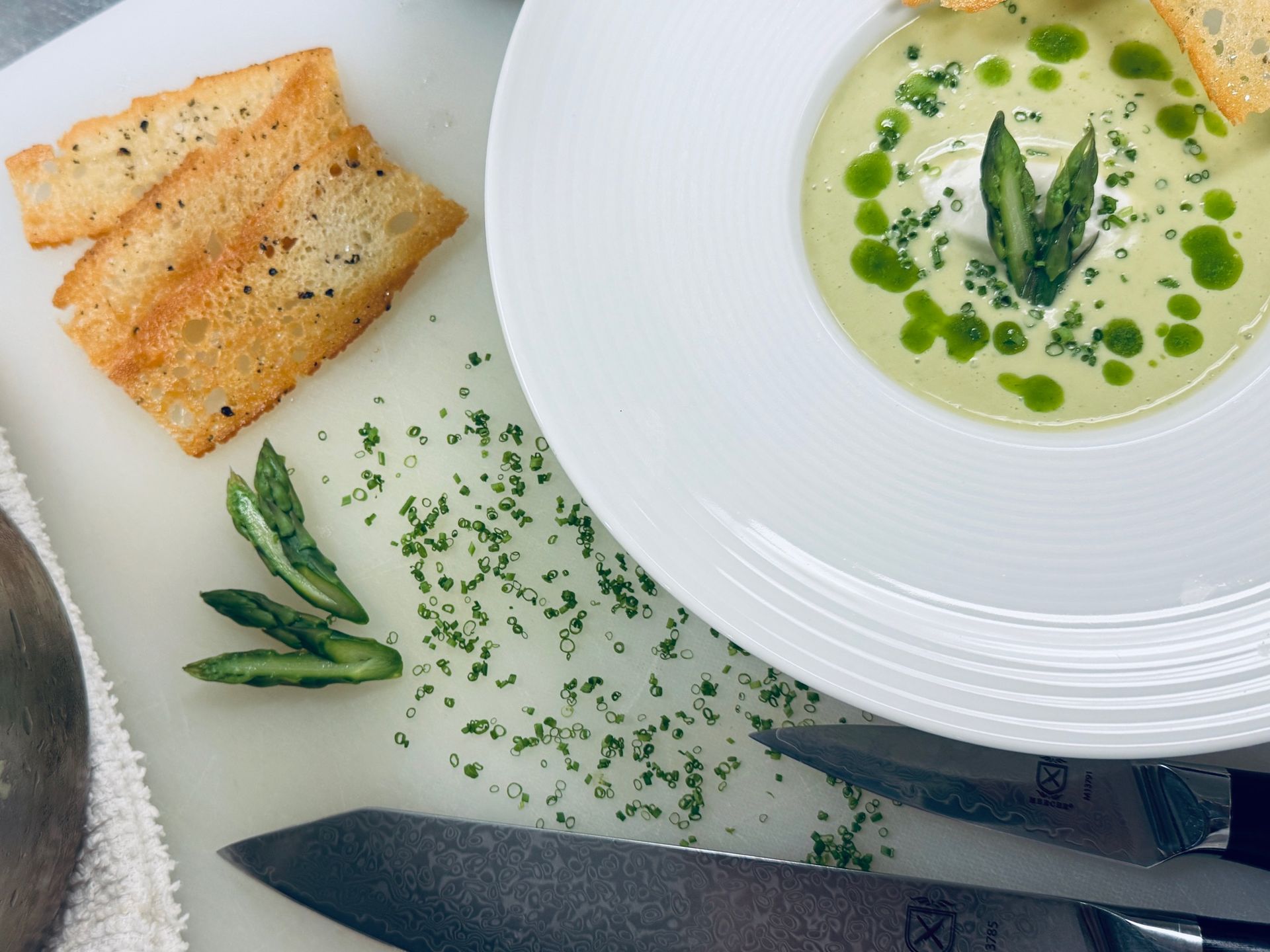 Chilled asparagus and leek soup topped with goat cheese mousse is a soup that I often served at the University Club of MU. This image comes from my Soup and Sauce class at Ozarks Tech. I originally developed this recipe to use up all of the left-over asparagus ends that we often had in abundance from large banquets. In class I evaluate my students on the flavor, viscosity, shape of the goat cheese quenelle, the size of the paper-thin baguette croustade and the thinness of the chives. The chives of this thickness can only be cut with a razor-sharp knife. Here I used my Damascus steel Mercer French Knife.