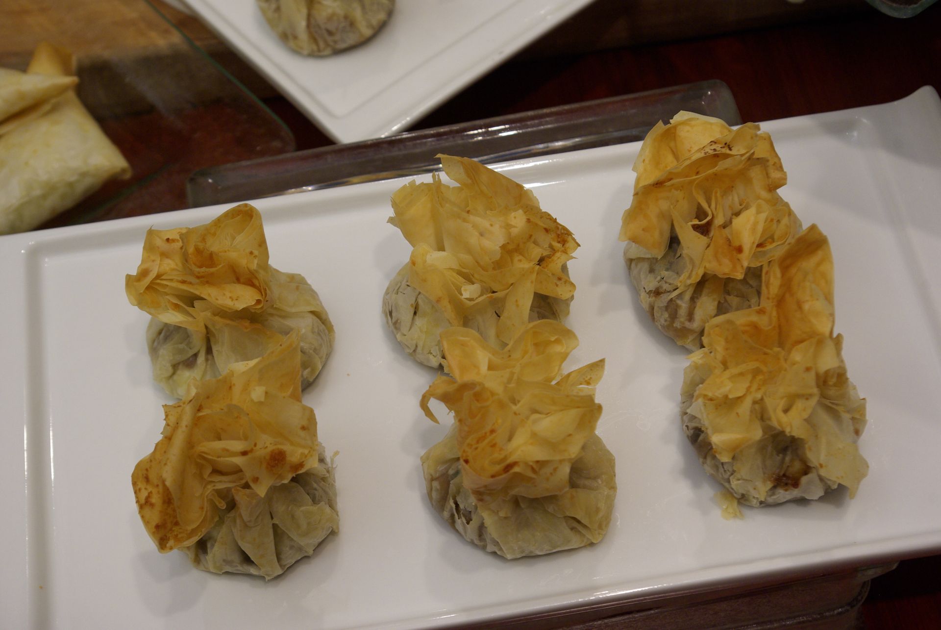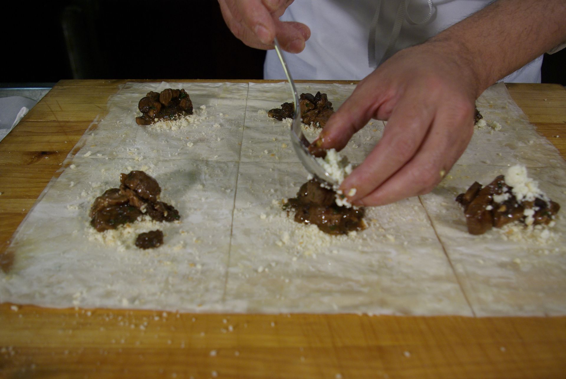 Phyllo pastry is often used in many savory pastry applications. The classic Greek Spanakopita is filled with a creamy spinach and feta cheese stuffing layered in laminated sheets of dough brushed with clarified butter and breadcrumbs. It is one of the specialties that I teach my students how to make in my World Cuisine class. Here is my recipe: