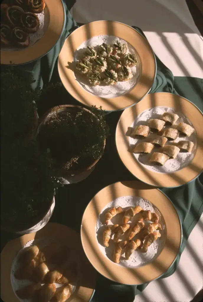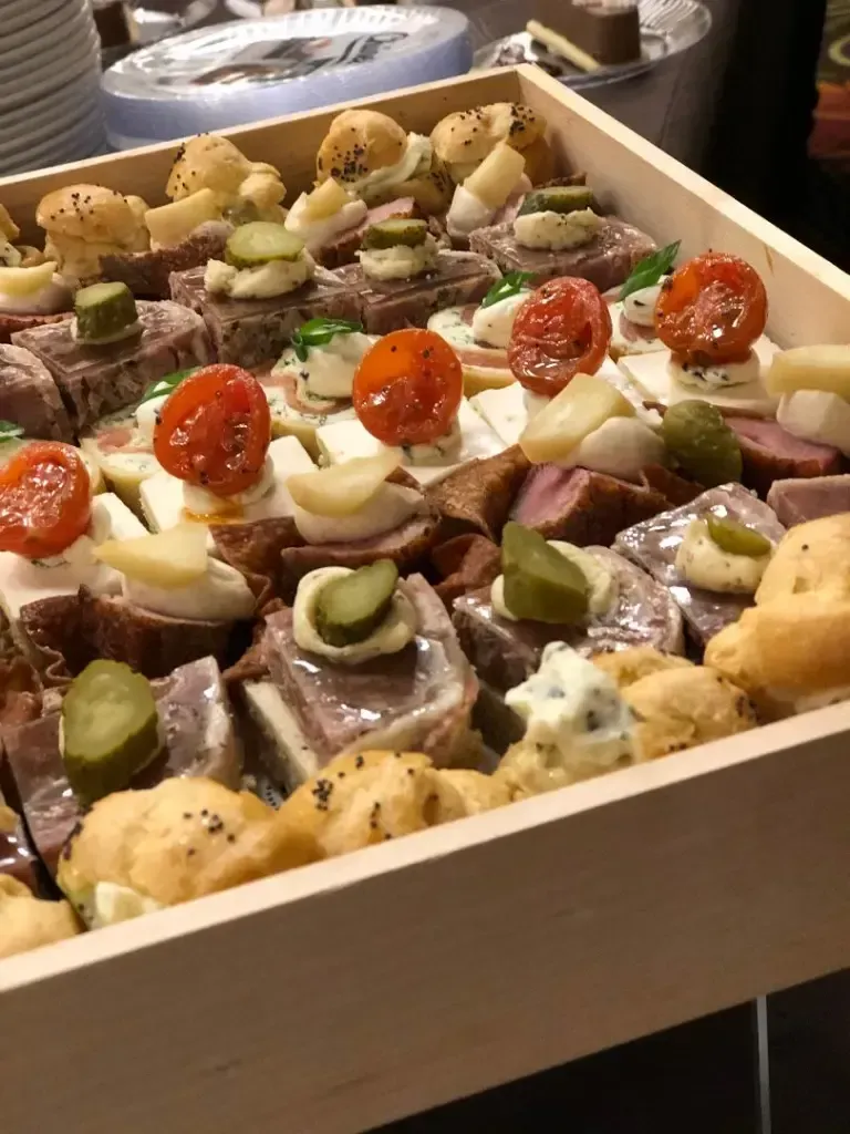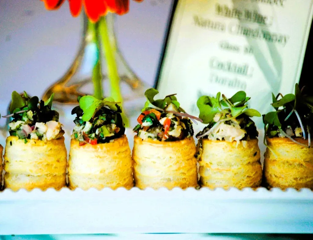 Accompanied in this tray with canapes the savory pastries included are curry chicken salad cream puffs, smoked salmon crepe roulades, and goat cheese sundried tomato tarts topped with a mock chaud froid sauce.